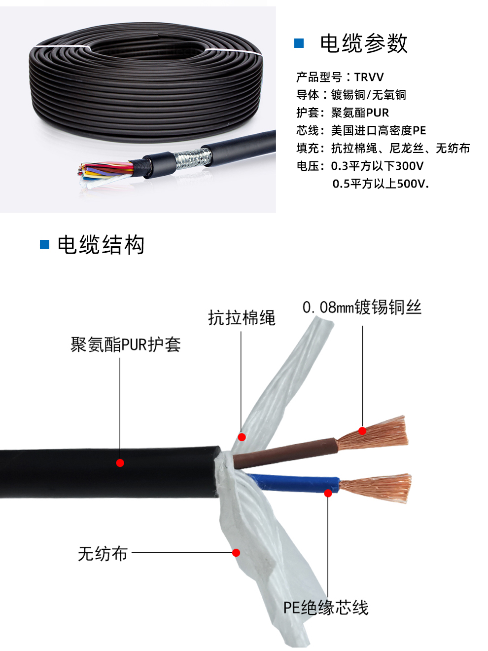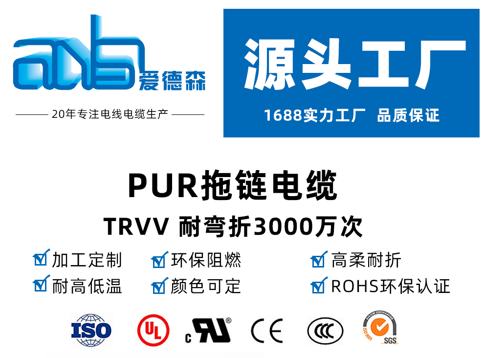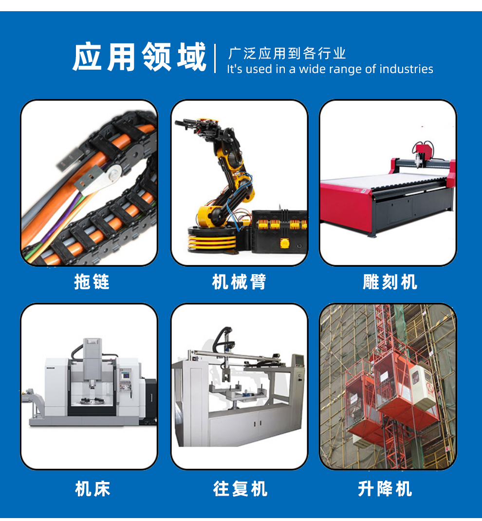 彎曲壽命2000萬次以上, 防水、防油、耐寒、抗紫外線、耐磨、阻燃適用于干燥或潮濕的室內(nèi),無強應(yīng)力緩釋或強制引導的自有連續(xù)往復運動下的安裝,特別是工業(yè)使用環(huán)境下的頻繁彎曲場合,如木工機械、機床加工設(shè)備、物流輸送系統(tǒng)、起重機場合等。