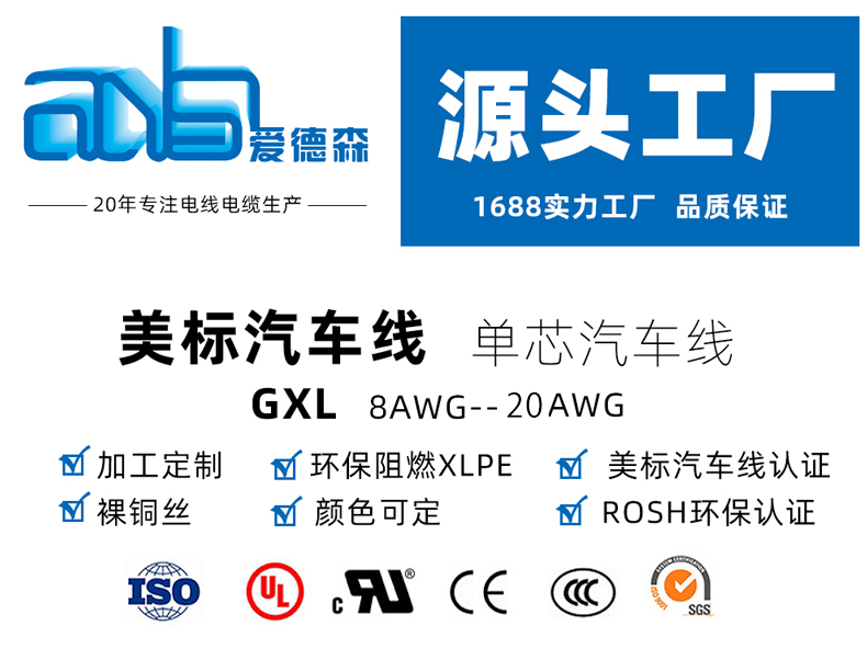 美標汽車線GXL產(chǎn)品特征 導體:導體由符合ASTM B3要求的軟銅線絞合而成 絕緣:XLPE (交聯(lián)聚乙烯) 標準:SAE J1128 工作溫度:40 C - 125 C 美標汽車線GXL產(chǎn)品參數(shù) 導體 絕緣 耐壓強度 規(guī)格 AWG