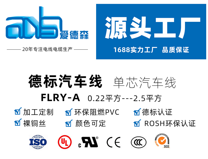 德標(biāo)FLRY-A汽車線產(chǎn)品特征 額定溫度:100C 參考標(biāo)準(zhǔn):ISO 6722 導(dǎo)體使用絞合0.22-2. 5mm裸銅 PVC絕緣,符合ROHS環(huán)保標(biāo)準(zhǔn) 通過ISO 6722阻燃測試 使用標(biāo)準(zhǔn)絕緣厚度、易裁線、易剝皮 用于汽車內(nèi)部連