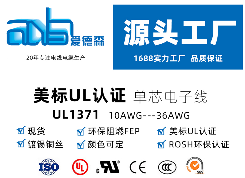 美標(biāo)UL1371鐵氟龍電線產(chǎn)品特征 1、額定電壓:無要求 2、工作溫度:-65~+105℃ 3、導(dǎo) 體:實芯或絞合鍍錫銅線 4、絕 緣: FEP 鐵氟龍 5、顏 色:紅/黃/蘭/白/黑/黃綠/棕等 美標(biāo)UL1371鐵氟龍電