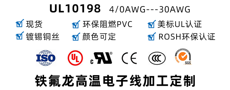 美標(biāo)UL10198 PVC電子線產(chǎn)品特征 1.額定溫度:105C 2.額定電壓:300V 3.執(zhí)行標(biāo)準(zhǔn):UL758UL1581 4.導(dǎo)體使用單根或絞合30-4/0AWG鍍錫或裸銅線 5.絕緣采用柔軟聚氯乙烯材料 6.通過UL VW-1CSA FT1垂直燃燒